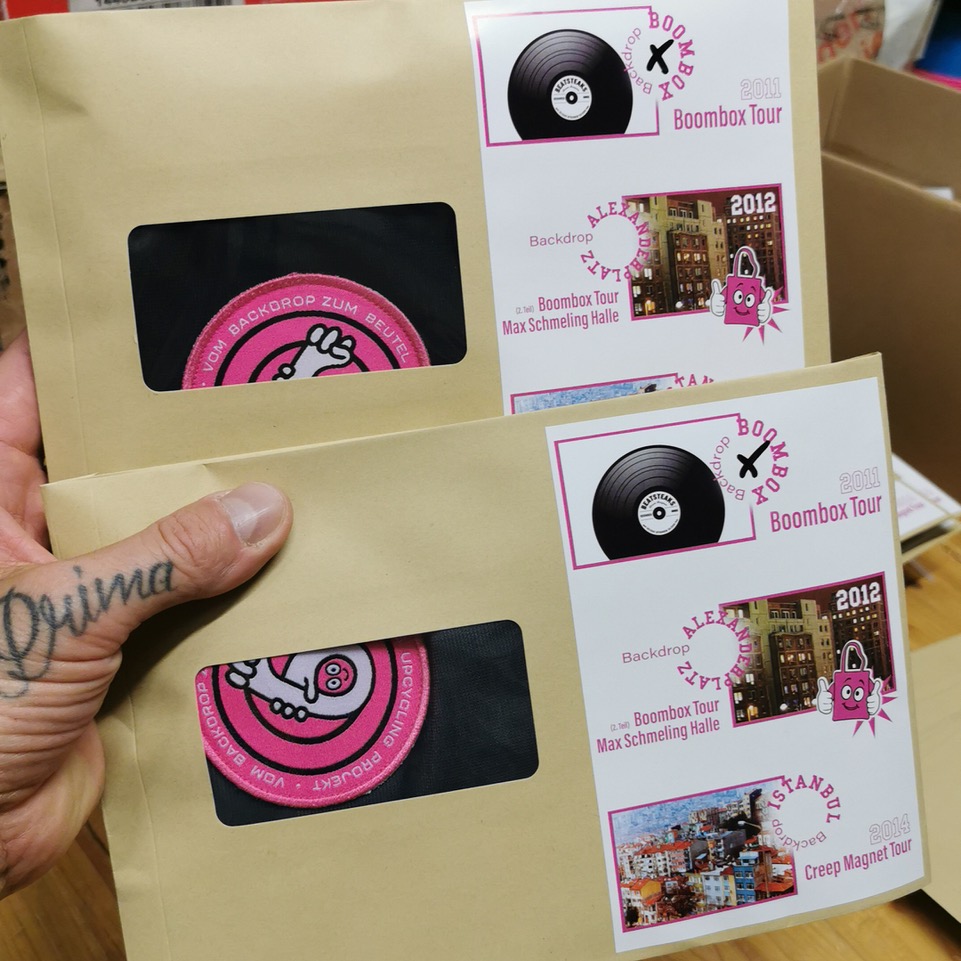 Jede Tasche ist mit dem BS Upcycling Patch versehen und kommt hochwertig verpackt mit Info Sticker, welches Backdrop hier verarbeitet wurde.